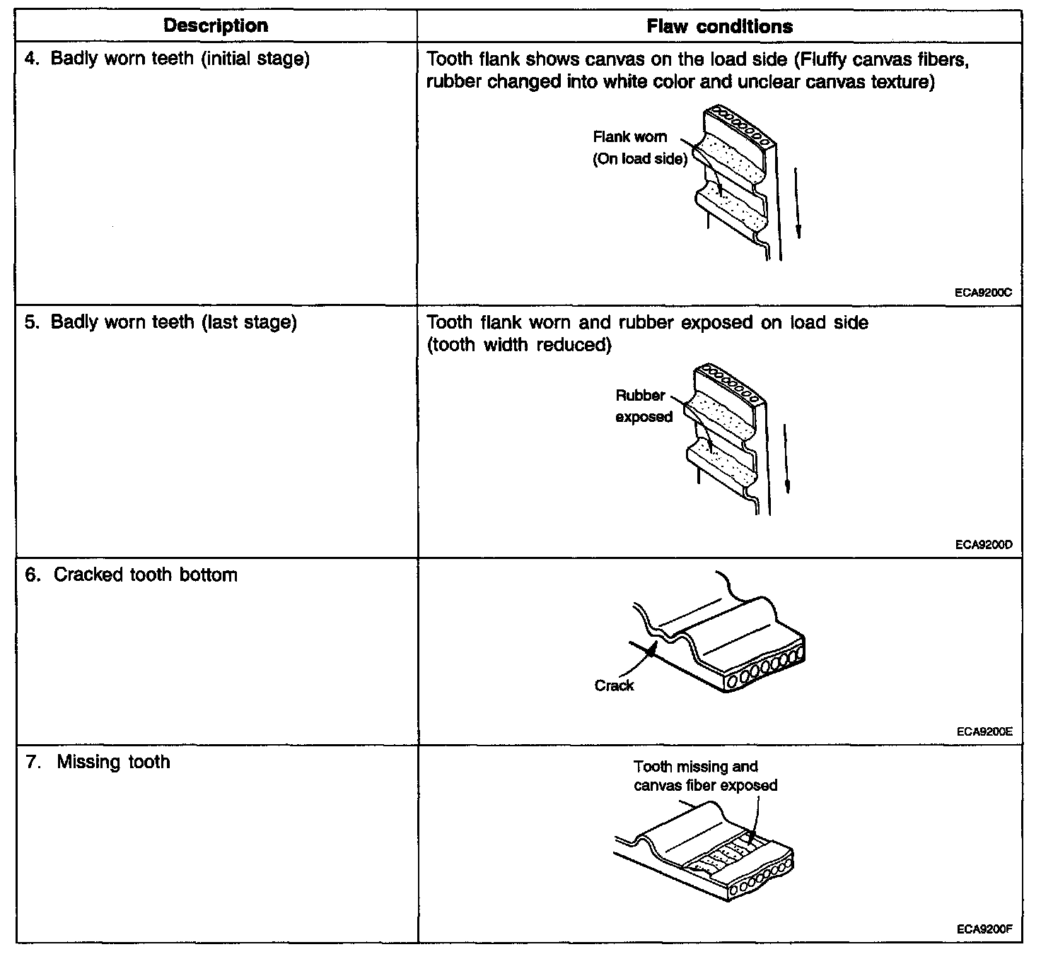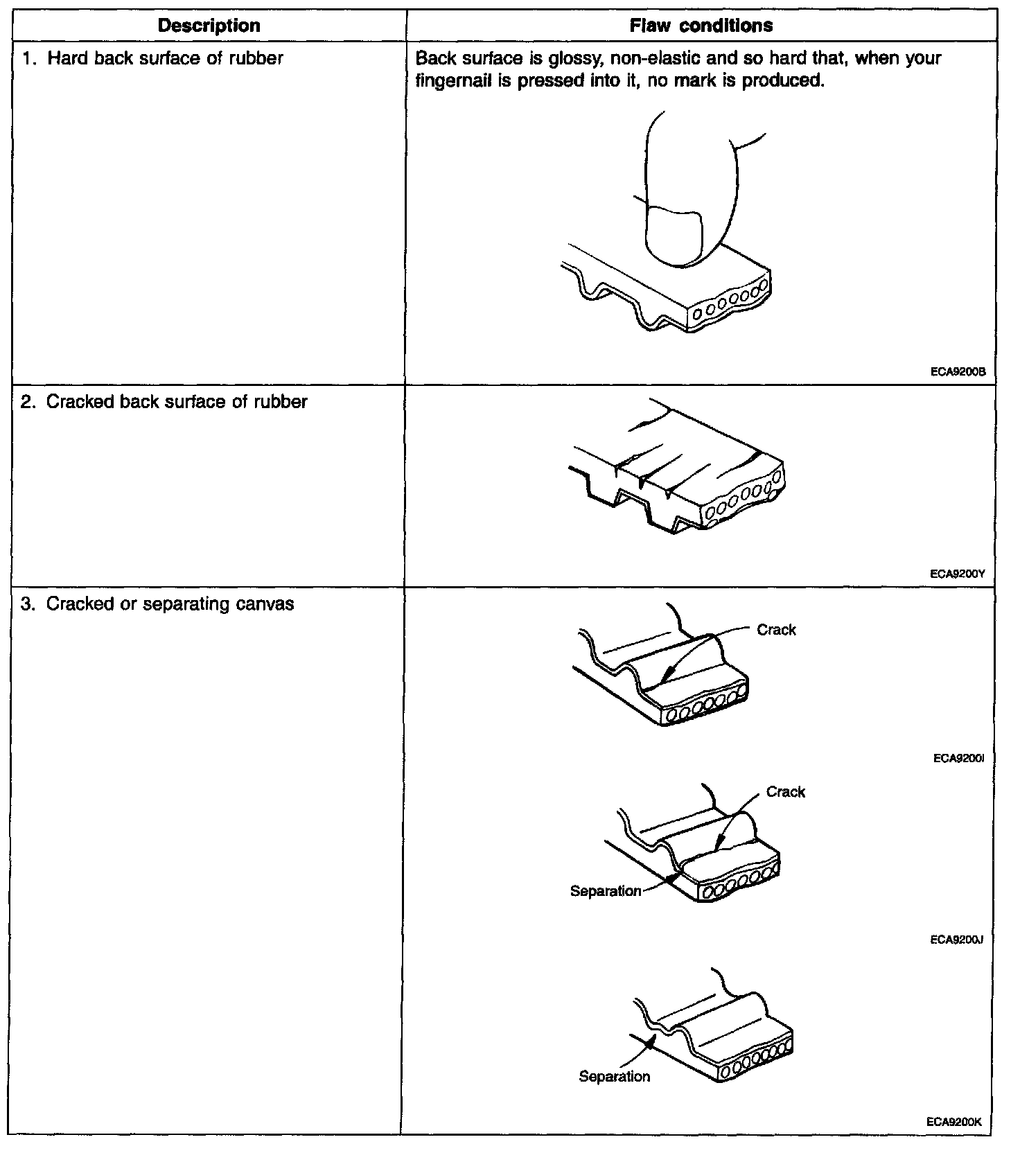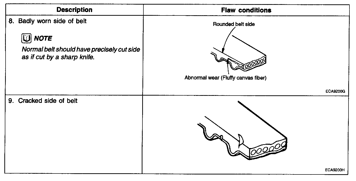 2. When the engine is overhauled or belt tension adjusted, check the belt carefully. If any of the following flaws are evident, replace the belt.