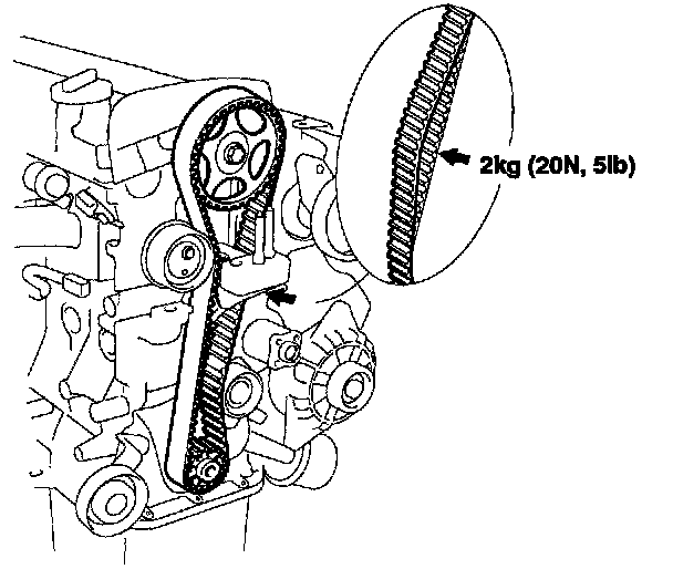 4. Recheck the belt tension. When the tension side of timing belt is pushed horizontally with a moderate force [approximately 2 kgf (20 N, 5 lbs.)], the timing belt cog end sags in approximately 4 - 6 mm (0.16 - 0.24 in.).