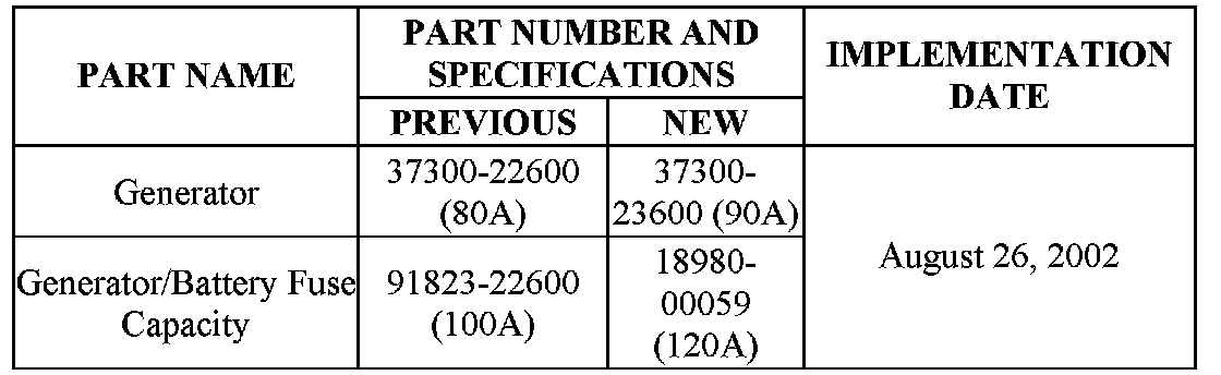 The generator for the 2001-03 MY Elantra and 2003 MY Tiburon vehicles with 2.0L engines has been changed to a higher capacity.