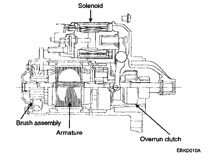 STARTING SYSTEMThe starting system includes the battery, starter motor, solenoid switch, ignition switch, inhibitor switch(A/T), ignition lock switch, connection wires and the battery cable. When the ignition key is turned to the start position, current flows and energizes the starter motor's solenoid coil. The solenoid plunger and clutch shift lever are activated, and the clutch pinion engages the ring gear. The contacts close and the starter motor cranks. In order to prevent damage caused by excessive rotation of the starter armature when the engine starts, the clutch pinion gear overruns.
