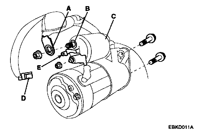 2. Disconnect the starter cable(A) from the B terminal(B) on the solenoid(C), then disconnect the connector(D) from the S terminal(E).