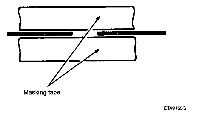 Wipe the glass adjacent to the broken heater line, clean with silicone remover and attach the masking tape as shown. Shake the conductive paint container well, and apply three coats with a brush at intervals of about 15 minutes apart. Remove the tape and allow sufficient time for drying before applying power. For a better finish, scrape away excess deposits with a knife after the paint has completely dried. (Allow 24 hours).