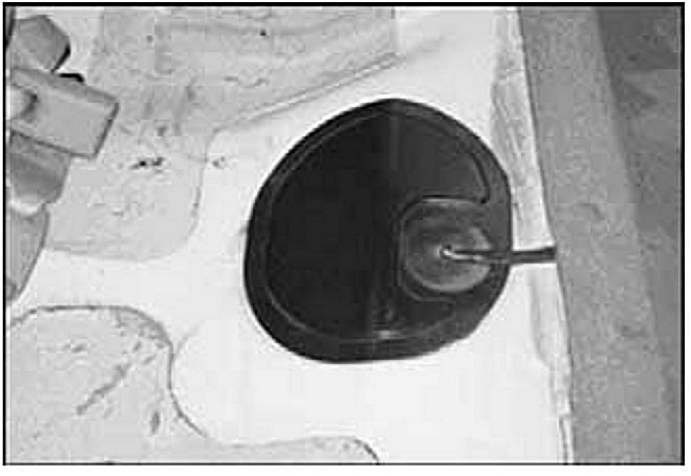 2. Carefully pull/pry open the fuel pump metal access-hole cover.