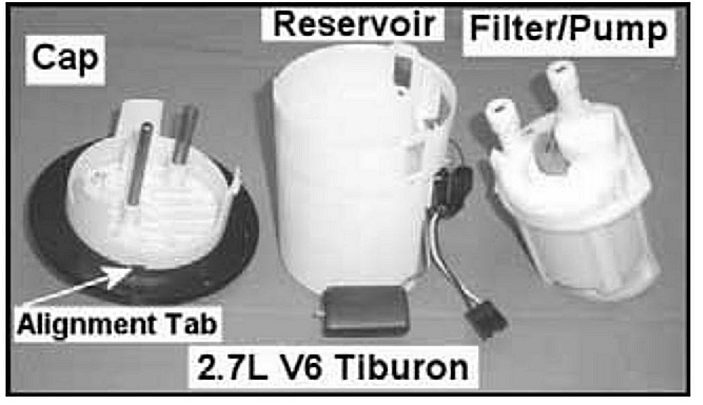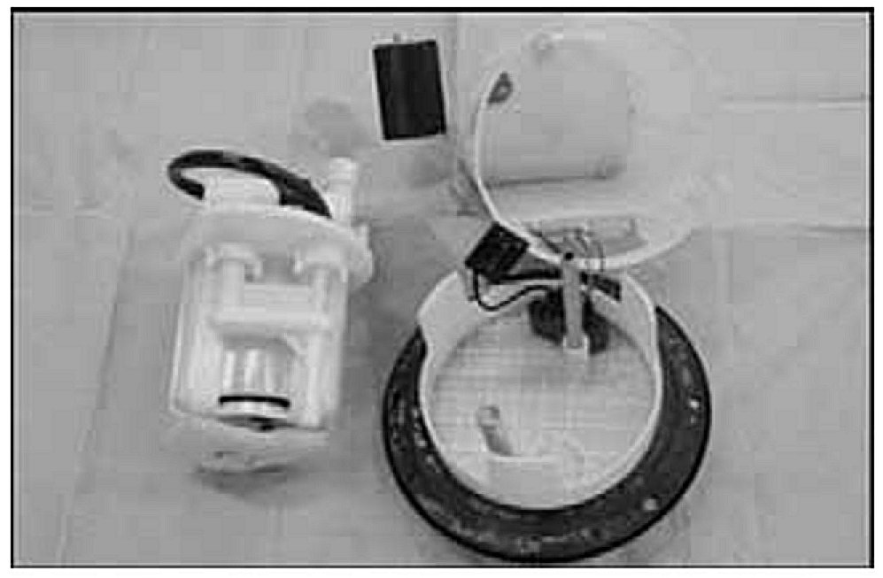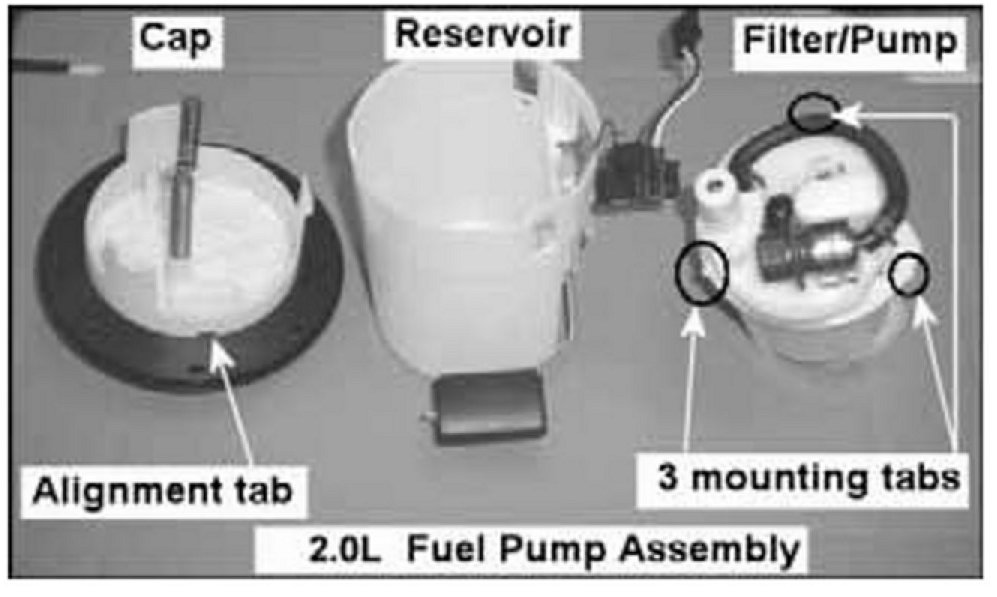 This picture shows the 2.0L fuel pump module separated into the three main parts for reference.