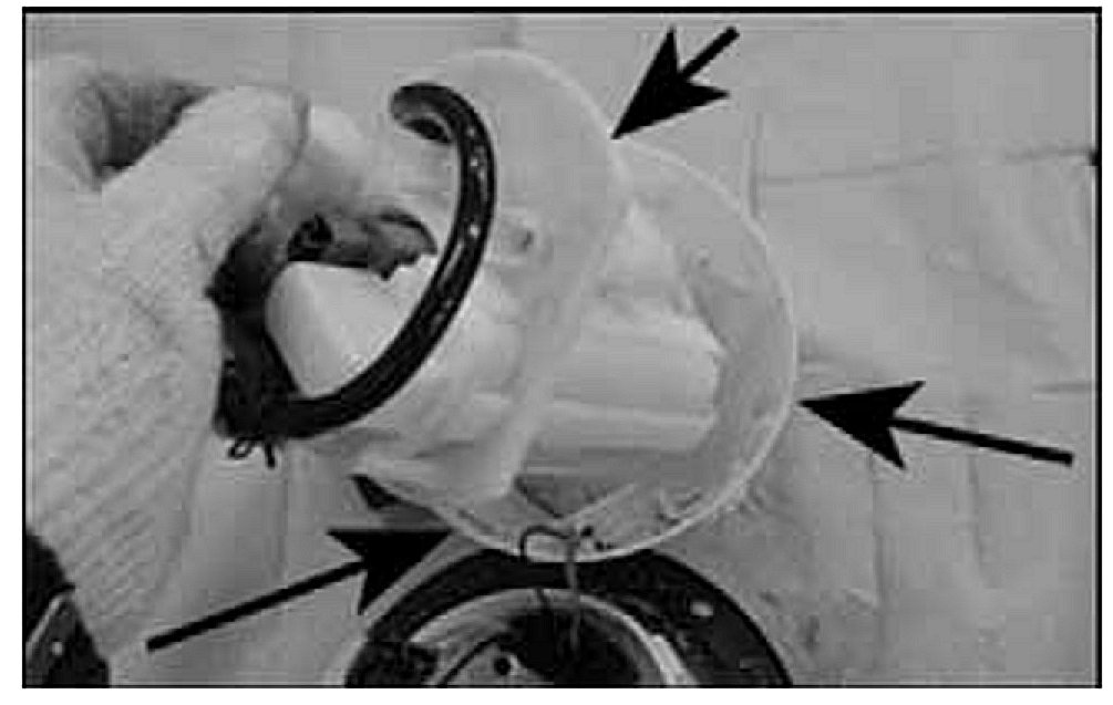 Do not tip the removed fuel pump module assembly inside the vehicle. The fuel contained in the reservoir may spill.