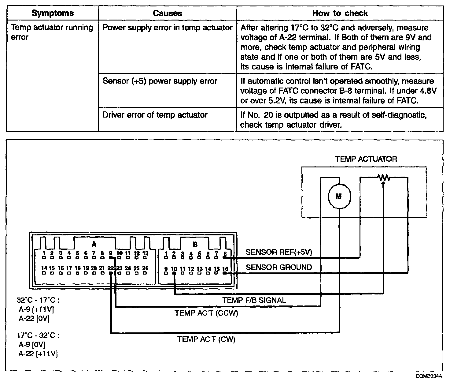 In adjusting temp switch from 32 C to 17 °C, 11 V is outputted from FATC connector A-9 terminal, 0 V is supplied for A-22 terminal and temp motor works in direction of COOL. In adjusting temp switch from 17 °C to 32 °C, 11 V is outputted from FATC connector A-22 terminal, 0 V is supplied for A-9 terminal and temp motor works in direction of WARM. When temp actuator has to move to a certain location for its automatic control, temp feedback signal terminal moves equally in temp actuator and informs controller of location of temp actuator through FATC connector B-10