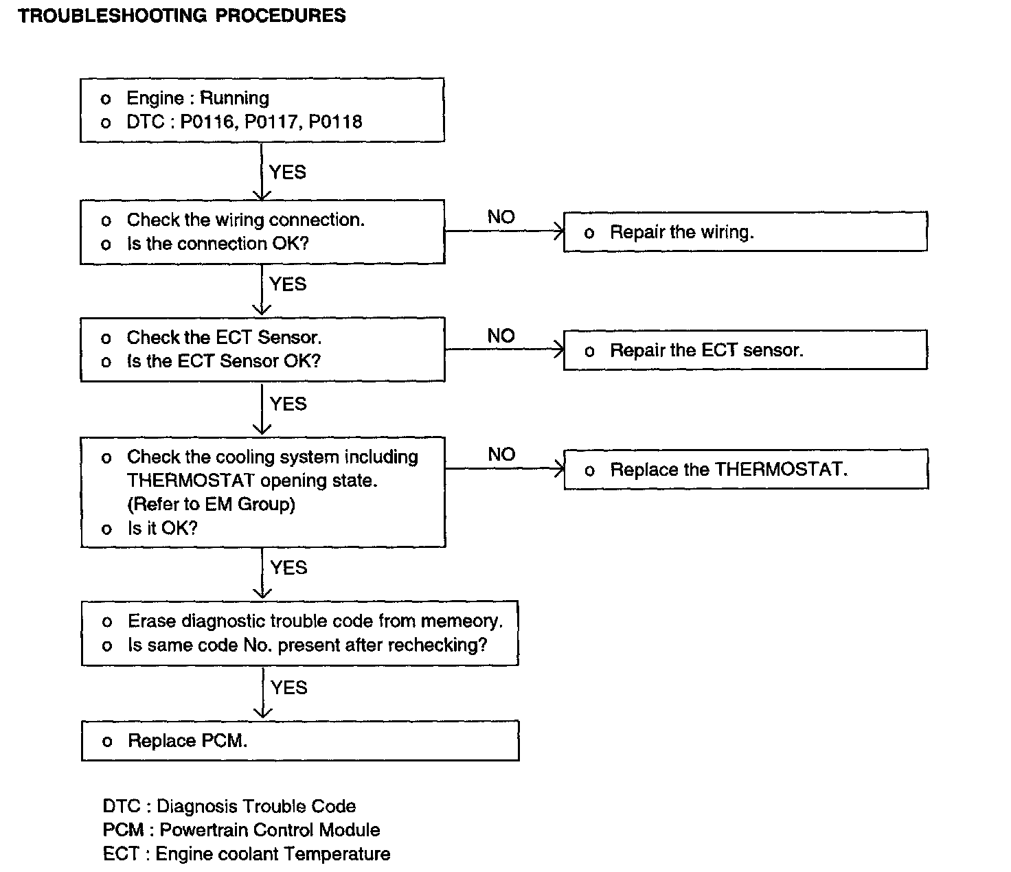 The engine coolant temperature sensor installed in the engine coolant passage of the cylinder head detects the engine coolant temperature and emits signals to the PCM. This part employs a thermistor which is sensitive to changes in temperature. The electric resistance of the thermistor decreases in response to a temperature rise (NTC). The PCM determines engine coolant temperature by the sensor output voltage and provides optimum fuel enrichment when the engine is cold.
