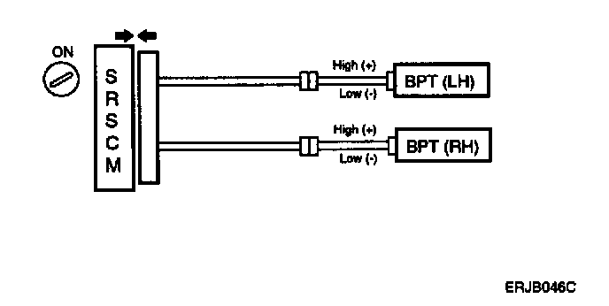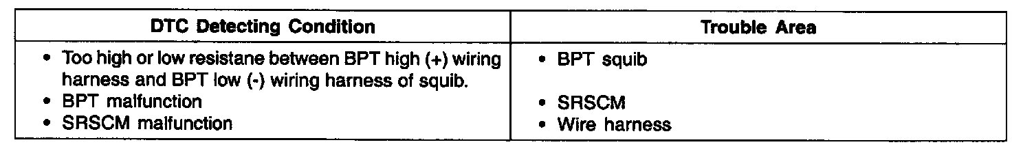The BPT squib circuit consists of the SRSCM and BPT. It causes the airbag to deploy when the airbag deployment conditions are satisfied. The above DTCs are recorded when the BPT circuit is open or the BPT resistance too high or low is detected in the BPT squib circuit.