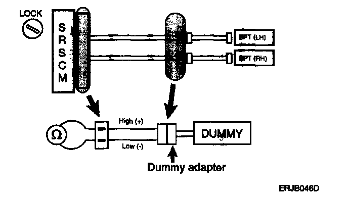 Release the airbag activation prevention mechanism on the SRSCM side of the airbag squib side. Connect the dummy (0957A-38200) and dummy adapter (0957A-1C000) to the BPT connector of the SRSCM connector side.