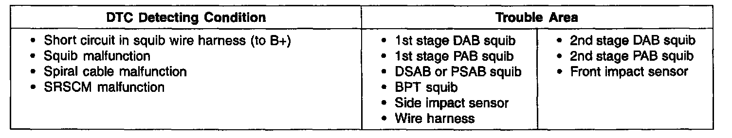 The above DTCs are recorded when a B+ short is detected in the squib circuit.