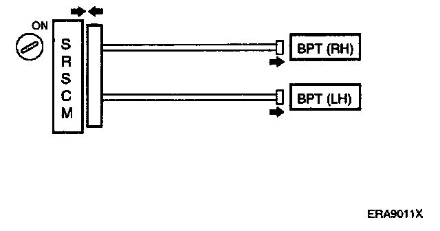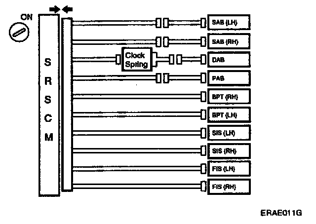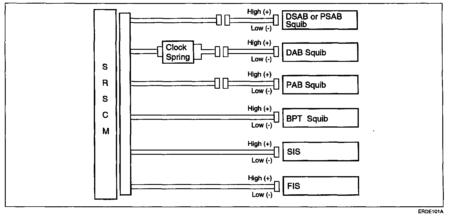 The squib circuit consists of the SRSCM, clock spring, DAB, PAB, SAB, BPT; FIS and SIS. It causes the SRS to deploy when the SRS deployment conditions are satisfied.