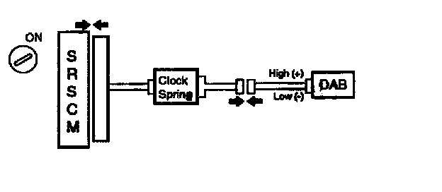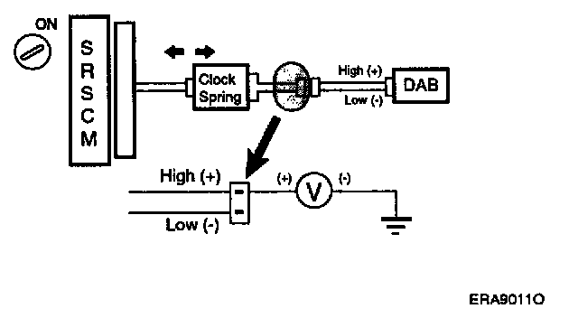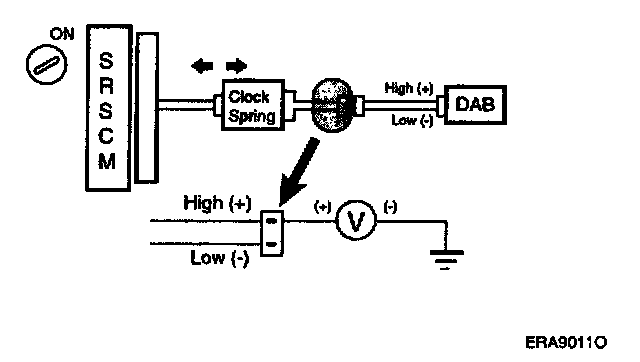 For the connector (on the clock spring side) between the clock spring and the DAB, measure the voltage between the DAB high and body ground.