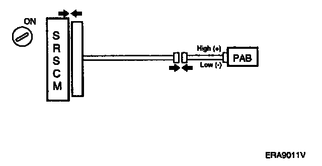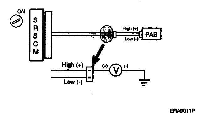 For the connector (on the SRSCM side) between the SRSCM and the PAB, measure the voltage between the PAB high and body ground.