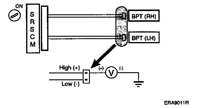 For the connector between the SRSCM and the BPT, measure the voltage between the BPT high and body ground.