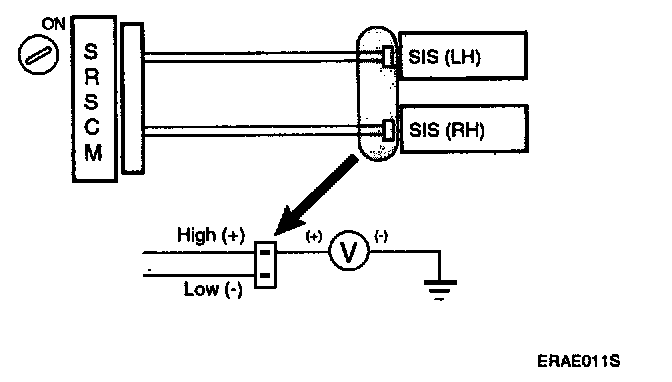 For the connector between the SRSCM and the side impact sensor, measure the voltage between the side impact sensor high and body ground.