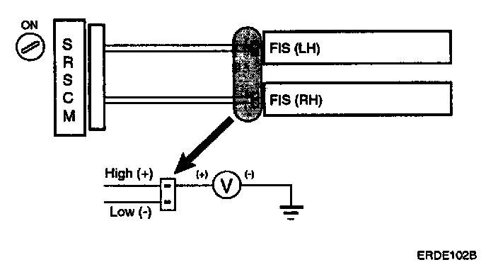 For the connector (on the SRSCM side) between the SRSCM and the SAB, measure the voltage between the SAB high and body ground.