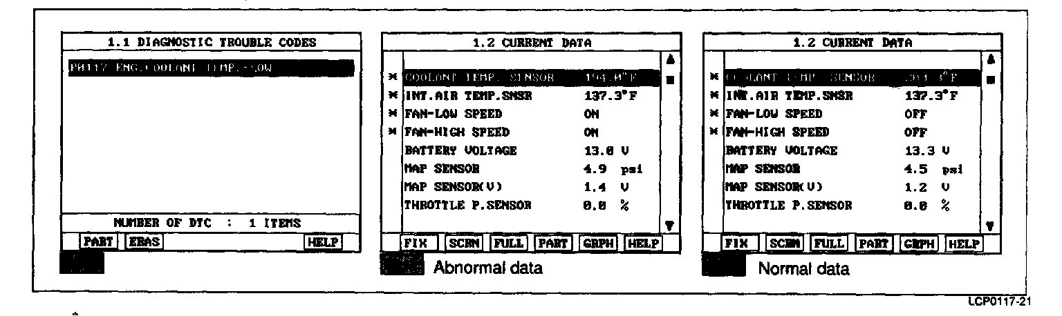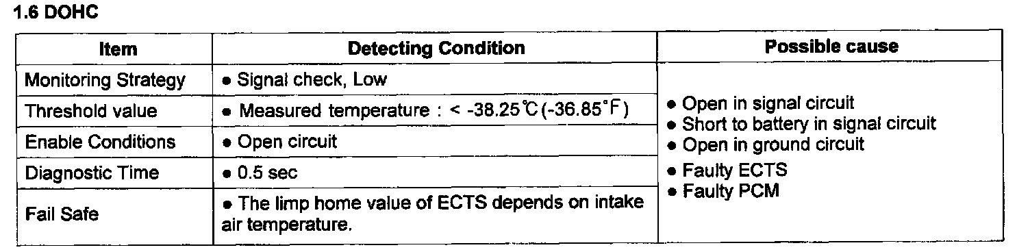 PCM sets DTC P0117 if the PCM detects signal voltage higher than the possible range of a properly operating ECTS.