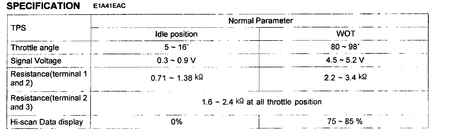 The Throttle Position Sensor (TPS) is mounted on the throttle body and detects the opening angle of the throttle plate. The TPS has a variable resistor (potentiometer) whose characteristic is the resistance changing according to the throttle angle. During acceleration, the TPS resistance between the reference 5 V and the signal terminal decreases and output voltage increases; during deceleration, the TPS resistance increases and TPS output voltage decreases. The PCM supplies a reference 5V to the TPS and the output voltage increases directly with the opening of the throttle valve. The TPS output voltage will vary from 0.2 - 0.8V at closed throttle to 4.3 - 4.8V at wide-open throttle.