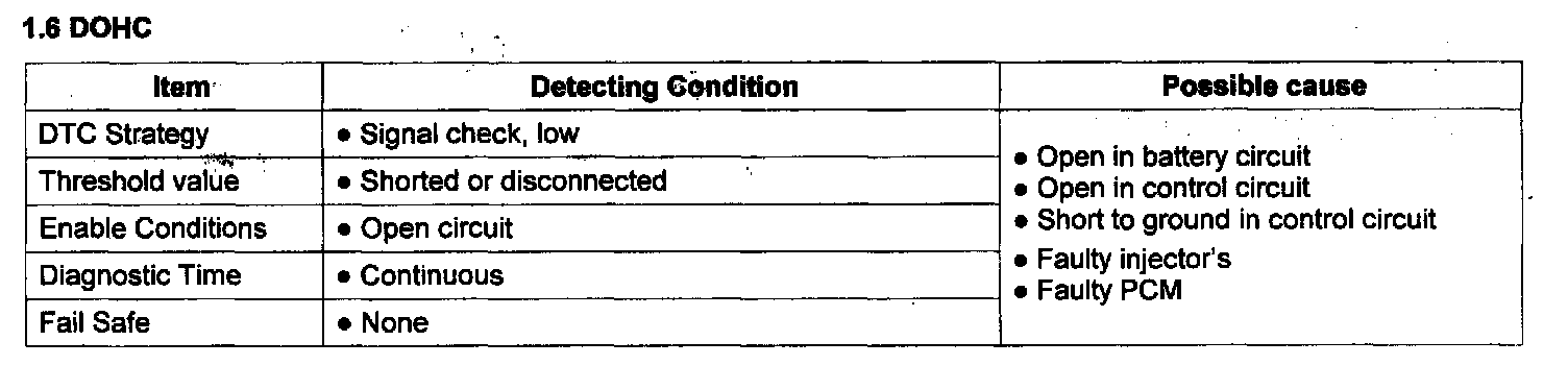 - Suspect area: Open or short circuit of power line from injector to PCM.
