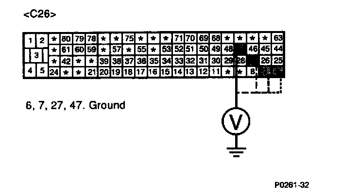 NOTE: In case the voltage between terminal 1 of injector and terminal 27, 6, 7 and 47 of PCM is 1 V respectively