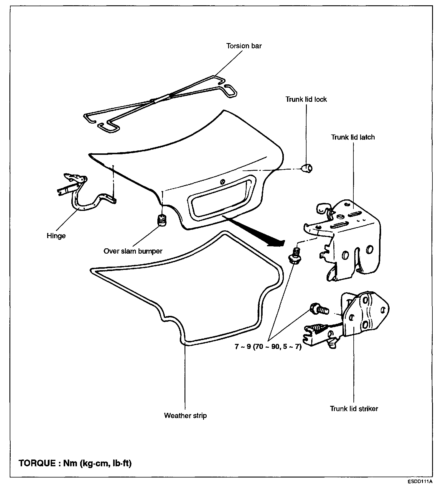 1. Remove the trunk lid hinge mounting bolts and remove trunk lid.