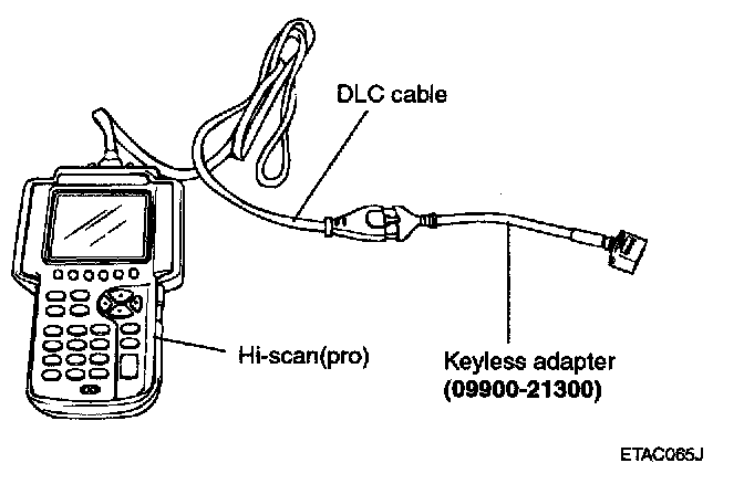 TRANSMITTER CODE REGISTRATION1. To register transmitter code, first connect key less adapter (09900-21300) to DLC (Data Link Connector) cable of hi-scan as shown in the illustration.