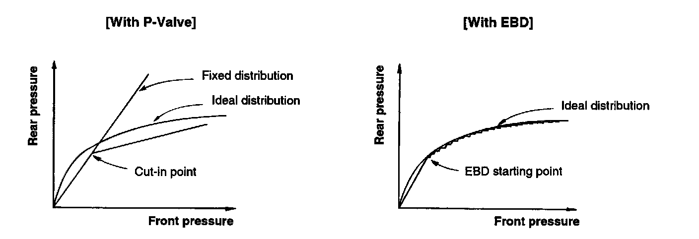 EBD controlled by the ABS Control Module, calculates the slip ratio of each wheel at all times and controls the brake pressure of the rear wheels not to exceed that of the front wheels.