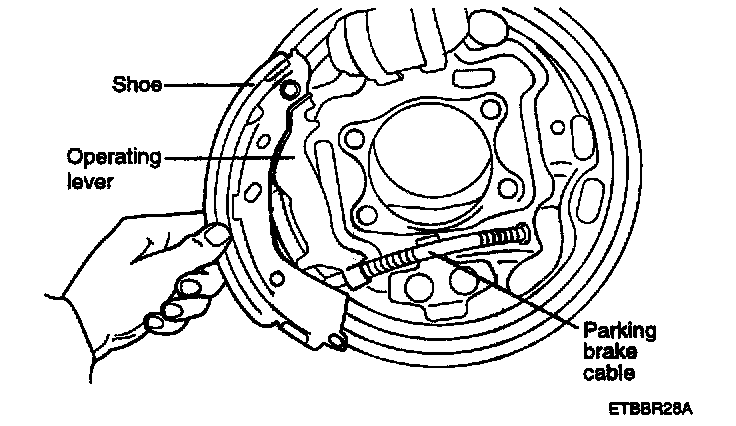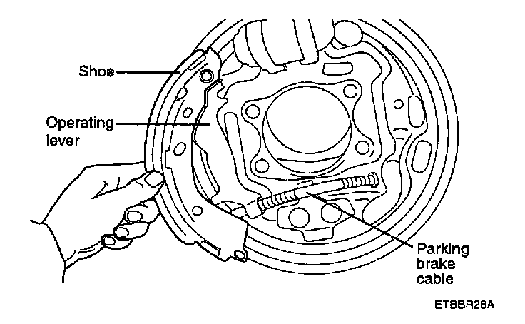 6. Remove the lower shoe spring and upper shoe spring. Disconnect the parking cable from the operating lever.