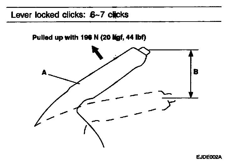 1. Pull the parking brake lever (A) with 196 N (20 kgf, 44 lbs.) force to fully apply the parking brake. The parking brake lever should by locked within the specified number of clicks (B)