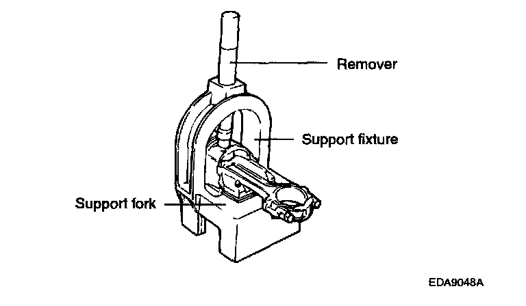 4. To remove the pin from the piston, place the piston in the support fixture with the rod resting on the fork inserts. Pass the remove tool through the top of the support fixture and use it to press out the pin.