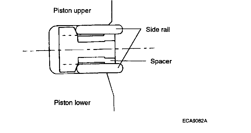 2. Install the upper side rail. To install the side rail, first put one end of the side rail between the piston ring groove and spacer, hold it firmly, and press down with a finger on the portion to be inserted into the groove (as illustrated).