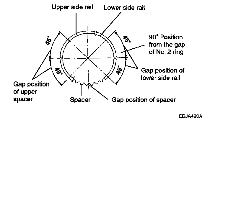 7. Position each piston ring end gap as far away from its neighboring gaps as possible. Make sure that the gaps are not positioned in the thrust and pin directions.
