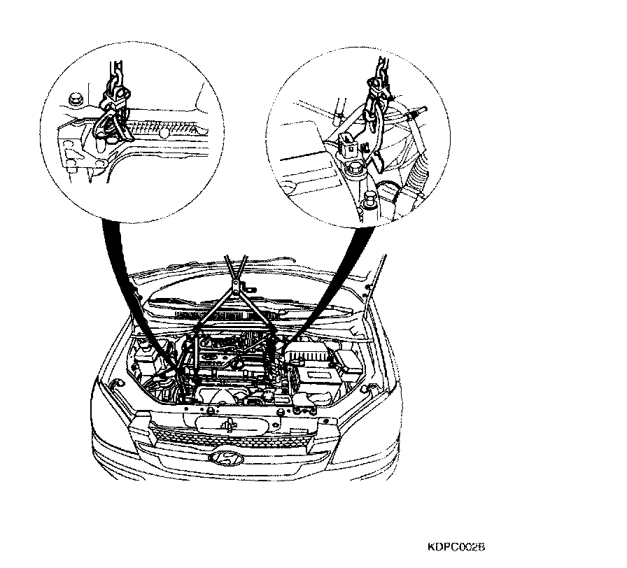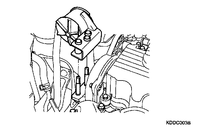 27. Slowly raise the engine (to the extent that the weight of the engine and transmission assembly is not applied to the mounting portions) and temporarily hold it in the raised position.