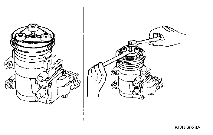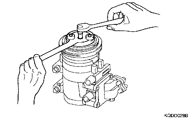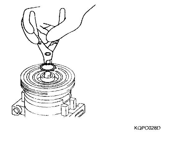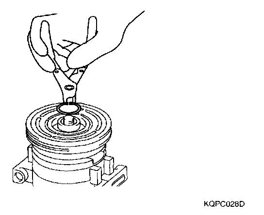 2. Pull out the clutch hub and shim from the compressor shaft. If it is hard to pull out, insert a 8 mm bolt into the shaft hole to remove the hub from the shaft.