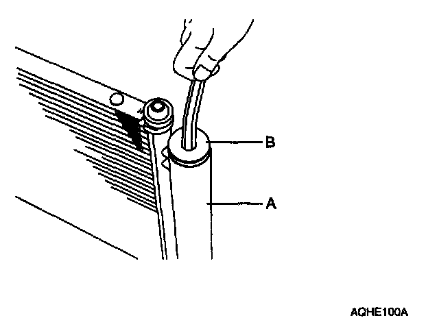 1. Remove the condenser, and then remove the bottom cap (B) from the receiver/drier tank (A).