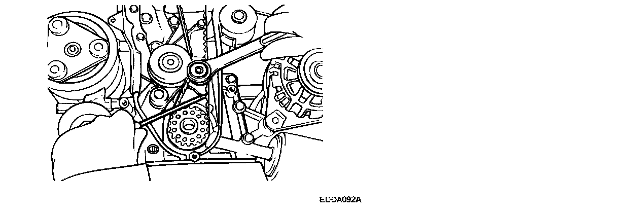 13. Check the tension of the timing belt. When the tensioner and the tension side of the timing belt are pushed in horizontally with a moderate force [approximately 49N (11 lb)], the the timing belt log end is approximately half of the tensioner mounting bolt head radius (cross flats) away from the bolt head center.