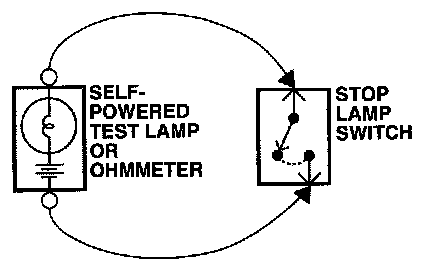B. Connect one lead of a self-powered test lamp or ohmmeter to one end of the pant of the circuit you wish to test. If you are using an ohmmeter, hold the leads together and adjust the ohmmeter to read zero ohms.