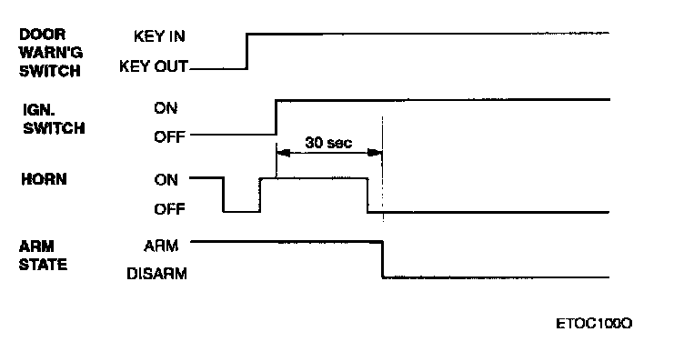 After the alarm state or start inhibit state are entered, if door warning switch on (key in ignition) & IGN 2 ON, if IGN 2 state is changed to OFF within 30 sec, remain in alarm state.