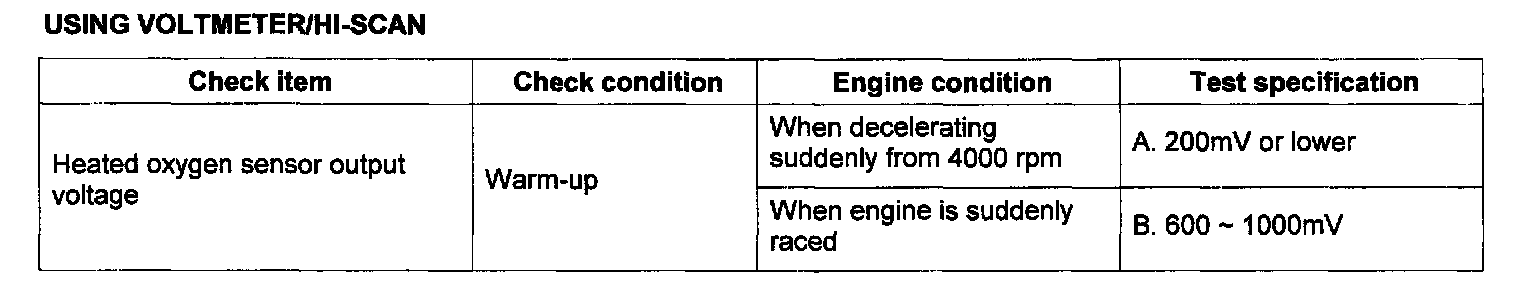NOTE: If you release the accelerator pedal suddenly after engine running about 4000 rpm, fuel supply will stop for short period and the O2 sensor service data in the HI-SCAN will display values in the A range.