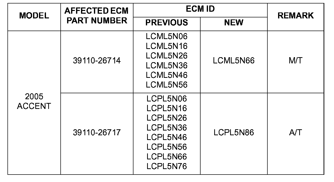 Certain 2005 ACCENT(LC) vehicles equipped with 1.6L engines may experience the following symptoms.