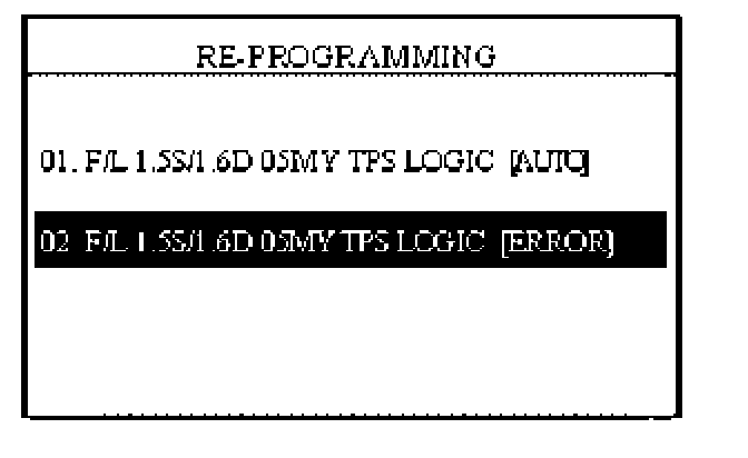 4. "REPROGRAM ERROR, PLEASE CHECK THE SYSTEM": In this case, the Manual Update Procedure must be used by selecting menu option "02. F/L 1.5S/1.6D 05MY TPS LOGIC [ERROR]".