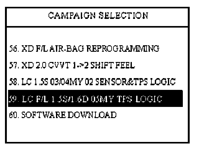 6. Select option "59. LC F/L 1.5S/1.6D 05MY TPS LOGIC" and press ENTER.