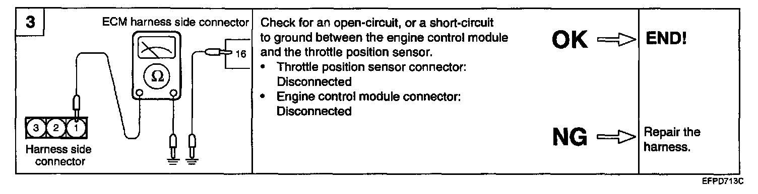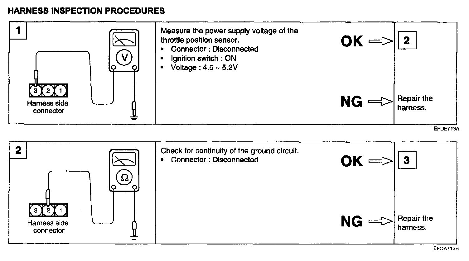 3. Input voltage from throttle position sensor is below 0.1V or above 4.7 V when ignition switch is turned on.