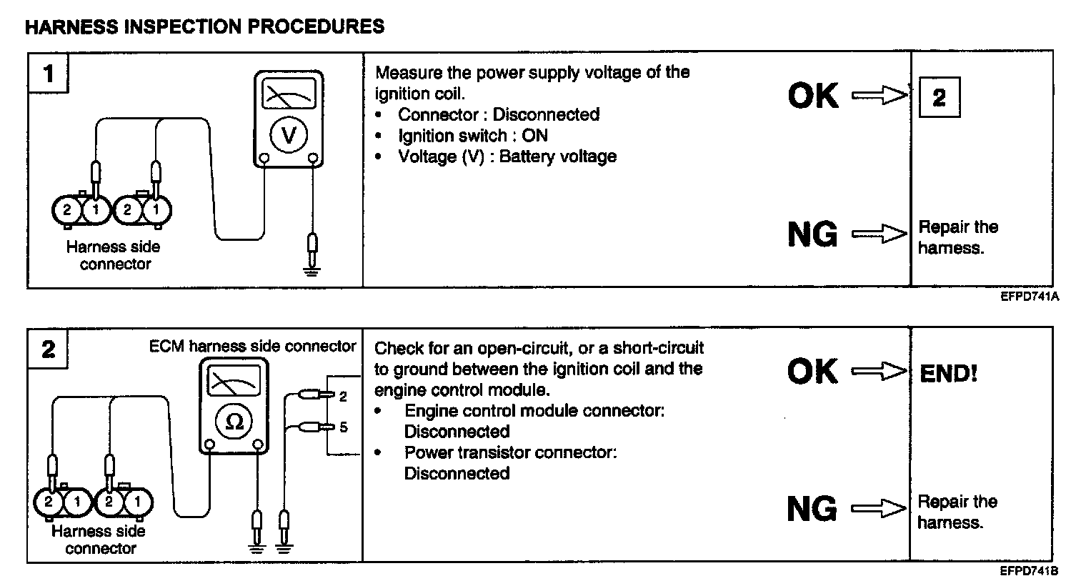 when the ignition power transistor is turned ON by a signal from the ECM, the ECM sends a signal to the ignition coil, then the primary current is shut off and a high voltage is induced in the secondary coil.