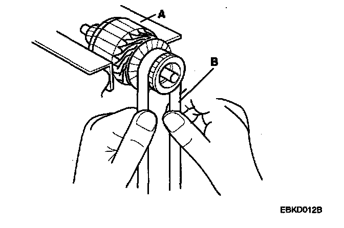 4. Check the commutator (A) surface. If the surface is dirty or burnt, resurface with emery cloth or a lathe within the following specifications, or recondition with #500 or #600 sandpaper (B).