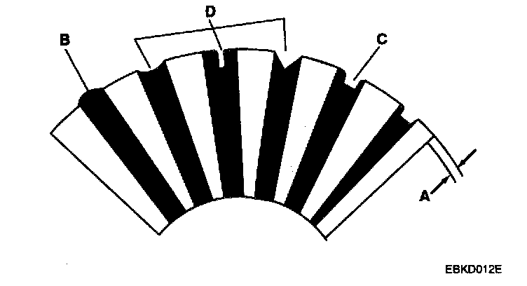 7. Check the mica depth (A). If the mica is too high (B), undercut the mica with a hacksaw blade to the proper depth. Cut away all the mica (C) between the commutator segments. The undercut should not be too shallow, too narrow, or V-shaped (D).