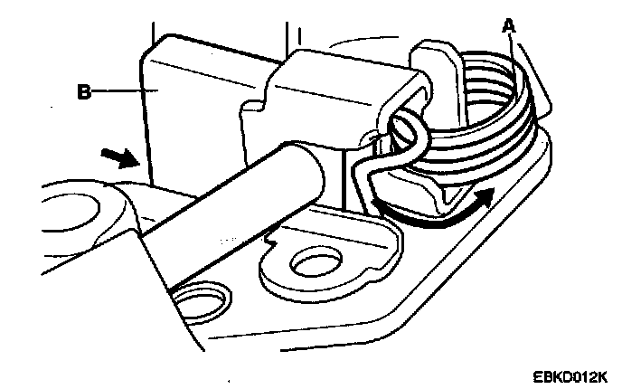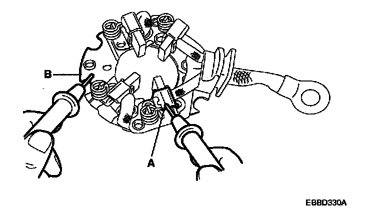 STARTER BRUSH HOLDER TEST1. Check that there is no continuity between the (+) brush holder (A) and (-) brush holder (B). If there is no continuity, replace the brush holder assembly.