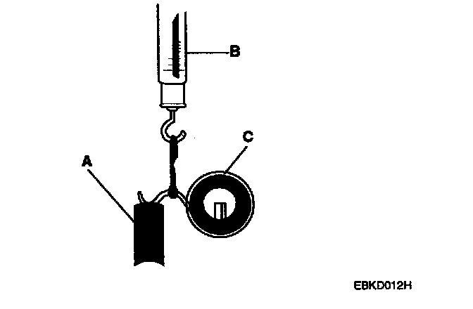 2. Insert the brush (A) into the brush holder, and bring the brush into contact with the commutator, then attach a spring scale (B) to the spring (C). Measure the spring tension at the moment the spring lifts off the brush.