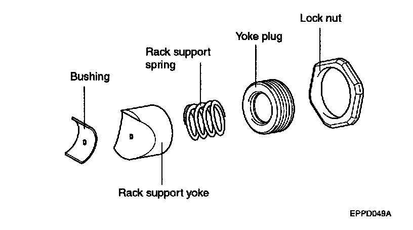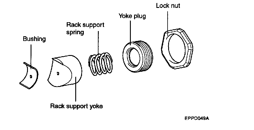 11. Remove the lock nut, yoke plug, rack support spring, rack support yoke and bushing from the gear box.
