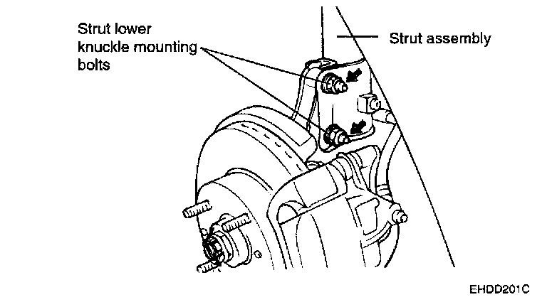 4. Remove the strut lower knuckle mounting bolts(2).